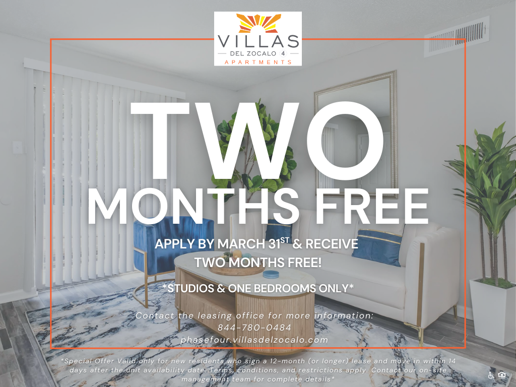 Villas del Zocalo Phase Four offers creatively designed studio, one, two, and three bedroom floor plans. Our spacious apartments for rent have well-appointed kitchens with a pantry and refrigerator. Stay cool with air conditioning, and your pets will feel right at home in our pet-friendly community. We provide more than apartments but a place you can truly call home.